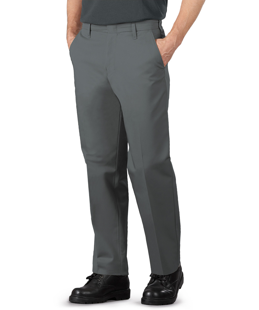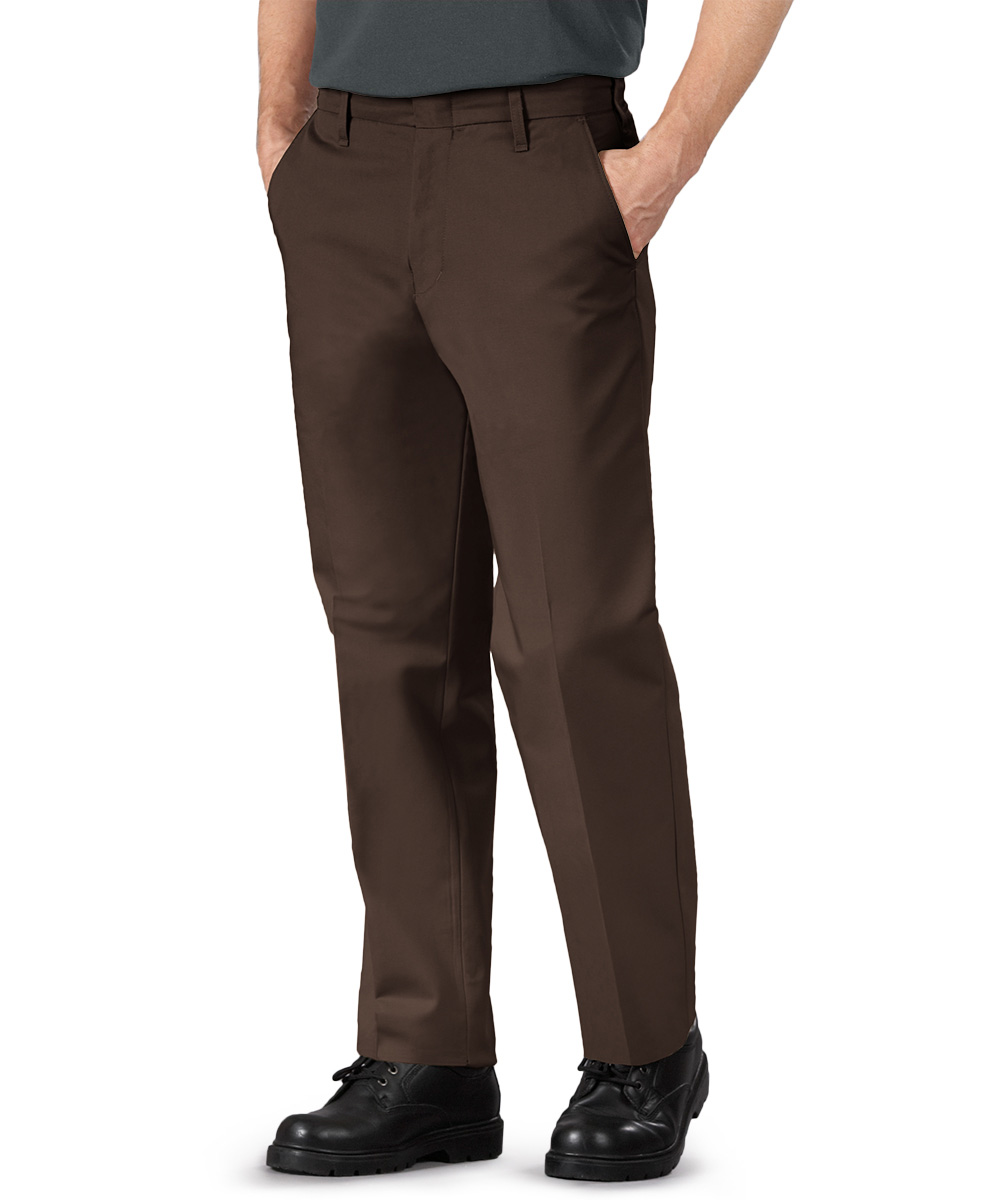 These SofTwill flat-front service pants feature hook-and-eye closure, heavy-duty brass